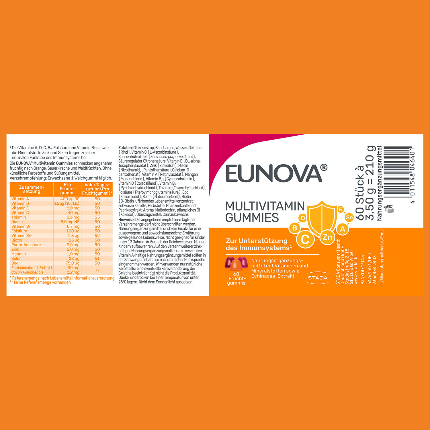 Laut der nationalen Verzehrstudie2 sind einige Erwachsene nicht optimal mit allen Nährstoffen versorgt. Dabei legen besonders Menschen mit einem aktiven Lebensstil besonderen Wert darauf, umfassend versorgt zu sein. Mit EUNOVA® Multivitamin Gummies finden Sie eine praktische und leckere Lösung zur Ergänzung Ihrer täglichen Vitaminzufuhr. Speziell auf die Bedürfnisse von Erwachsenen abgestimmt, bieten sie eine bedarfsgerechte Kombination von Vitaminen und Mineralstoffen. Die Vitamine A, D, C, B6, B12 und Folsäure, sowie Zink und Selen tragen zu einer normalen Funktion des Immunsystems bei. Mit nur einem Gummi täglich unterstützen Sie Ihr Immunsystem, sodass Sie auch in stressigen Zeiten fit und leistungsfähig bleiben können. Unsere bewusst dosierten Inhaltsstoffe gewährleisten eine sichere und effektive Ergänzung Ihrer Ernährung. So stellen Sie sicher, dass Ihr Körper stets mit den notwendigen Vitaminen versorgt ist und Sie Ihre Alltagsziele mit Energie und Freude erreichen können.